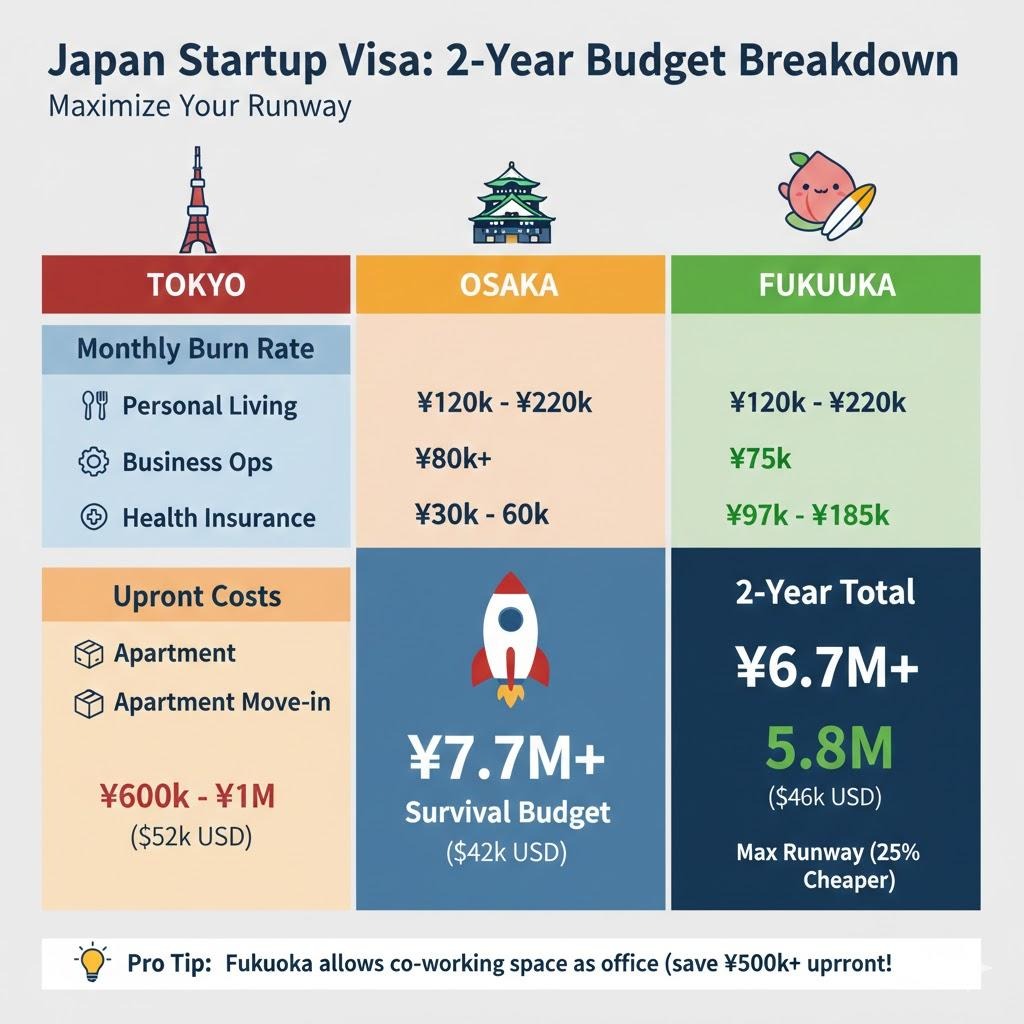 Monthly living costs vary significantly depending on the city and personal lifestyle, with major urban areas such as Tokyo requiring higher budgets. Founders should also account for business-related expenses, including product development, legal and accounting services, and other professional fees. Maintaining an emergency financial buffer is strongly recommended, as it provides flexibility if revenue generation takes longer than expected.